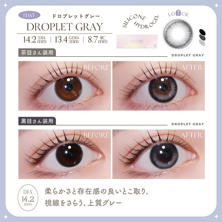 LARME Silicone Hydrogel 1 Day W MOIST Axis Lock Droplet Gray ラルムシリコンハイドロゲルダブルモイストUV ドロプレットグレー |